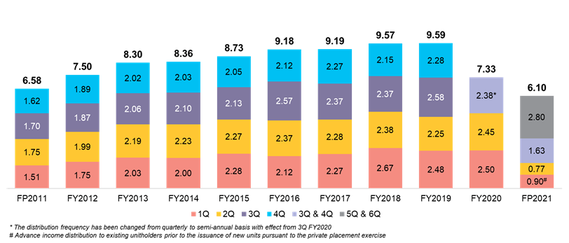 Sunway REIT has distributed 100% of its reported realised income from FY20111 to FY2019 and committed to distribute at least 90% of distributable income from FY2020 thereon.